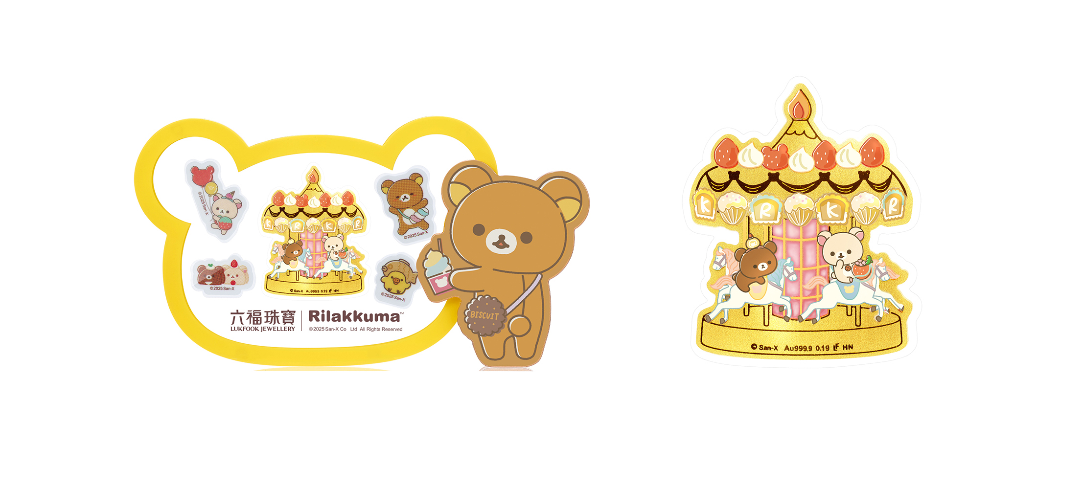 轻松一下,熊抱幸福 “ovo是微笑,oㅈo是轻松小熊”。六福珠宝与日本San-X再度携手,于全球分店推出全新Rilakkuma「轻松小熊」足金/铂金系列新品。将“蛋糕木马的欢乐、幸运苹果的祝福、上上签的期许”等元素立体呈现,携「纯真铂金」与「悠然哲学」空降六福珠宝! 乐园轻启,萌域展开,不妨跟着轻松小熊一起体验旋转木马、蛋糕、苹果和期许的上上签,拆解这份专属的幸福心法。以时尚萌趣的珠宝设计,为你解锁可佩戴的快乐法则。愿你和轻松小熊一样,与朋友随时随地感受快乐。轻松一下,熊抱幸福! 纯心相遇,熊抱纯真! Rilakkuma「轻松小熊」系列首饰打造多款兼具收藏价值与情感寓意的萌趣美饰。铂金的纯净质感与轻松小熊的纯然自在温柔碰撞,仿佛为美饰注入纯粹治愈力,而铂金“不易褪色、常亮如新”的特性,寓意着快乐历经岁月打磨也不会暗淡,时光里的美好瞬间将被永远珍藏。 萌力暴击双面派!时尚经典的铂金圆牌项链来袭。正面雕琢轻松小熊招牌笑脸,治愈力MAX,背面点缀苹果图案,寓意祈求「苹」添好运,菱格纹环绕周边,更有可爱骨头形状的OT扣加持,扣子两边也是小熊头形状,祈愿平安祝福从此轻松相伴。